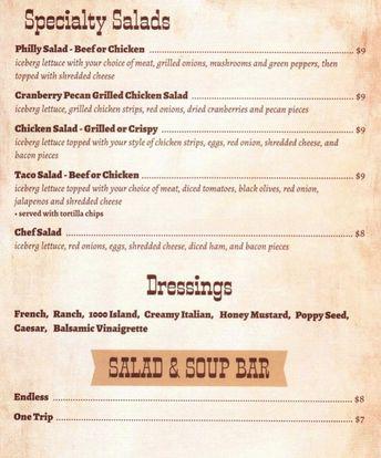 For lunch and dinner, the fried chicken steals the spotlight. Endless servings entice many diners, complemented by a side of fresh salad from the extensive bar. Satisfying burgers and specialty salads offer even more choices for guests.